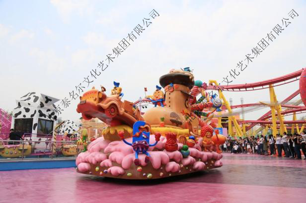 以国产原创动漫《饼干警长》为核心,将经典动画场景与角色生动复刻。花车设计聚焦于标志性卡通形象与代表性甜品元素,巧妙融入景区整体氛围;为适配北方特殊气候,采用高饱和度的亮丽色彩,确保在秋冬沙尘天气下依然呈现卓越的视觉表现力,持续传递欢乐。此举开创了本土动漫IP与主题公园深度融合的全新模式,为品牌注入独特文化内涵。