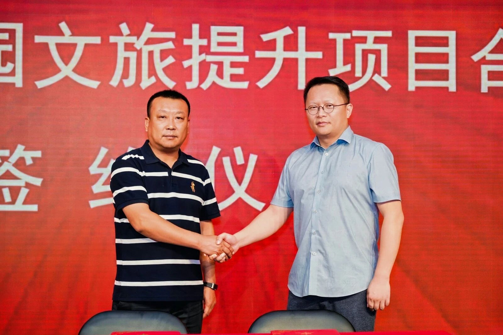 图为伊春市金林区区委常委、宣传部长隋鹏先生与北京泰名尔文化艺术有限公司总经理吴业竖先生进行项目签约