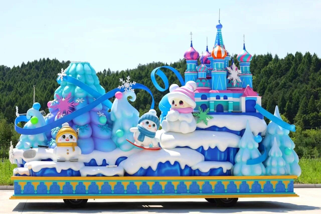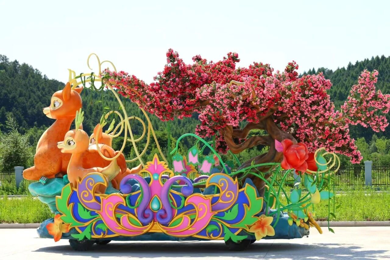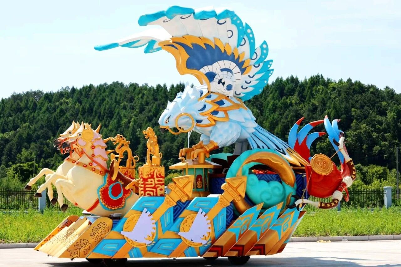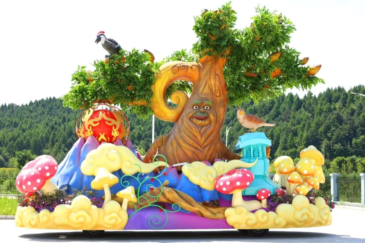 花车设计不仅注重视觉冲击力,更融入动态特效:虎头摆动、翅膀扇动、雪花机喷洒等细节,让静态的造型焕发生命力。夜幕降临时,花车更以夜光效果点亮林海,为观众呈现一场光影交织的奇幻盛宴。