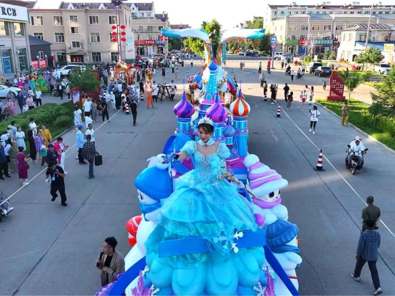 巡游队伍中,47名演员的表演同样精彩纷呈。“金翎飞霄”方阵的男演员们身着女真武士铠甲,手持长矛跳起刚劲有力的战舞;“钟林毓秀”方阵的女演员则化身森林精灵,轻盈的舞步配合着花车上摇曳的蓝莓枝桠,演绎出林间仙境的唯美画面。演员们还不时走下花车与观众互动,教小朋友模仿鄂伦春族的传统舞蹈动作,现场笑声不断。